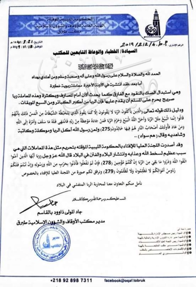 لجنة افتاء طبرق تحرم تبديل الصك بالنقود