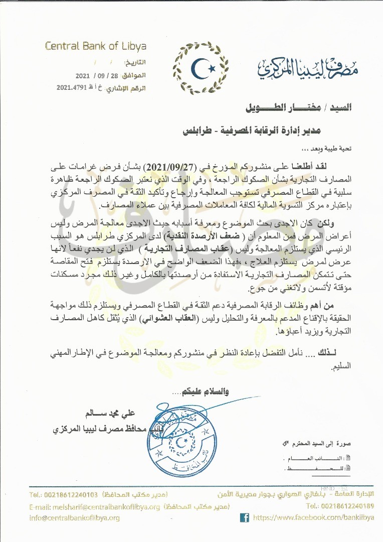 الحبري يرد على مركزي طرابلس بِشأن فرض غرامات على المصارف