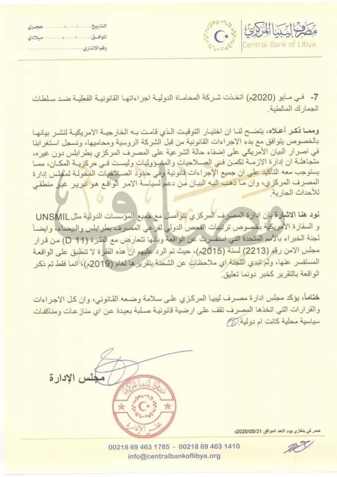 وأوضح المصرف أن اختيار التوقيت من قبل الخارجية الامريكية لنشر بيانها يتوافق مع بدء الإجراءات القانونية من قبل الشركة الروسية ومحاميها، معربا عن استغرابه من إصرار البيان الأمريكي على إضفاء صفة الشرعية على مركزي طرابلس دون غيره، متجاهلة أن إدارة الازمة تكمن في الصلاحيات والمسؤوليات وليست في مركزية المكان.