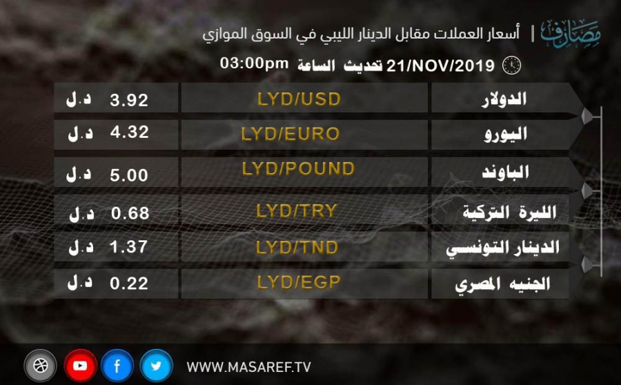 اسعار العملات مقابل الدينار الليبي في السوق الموازي 2019/11/21