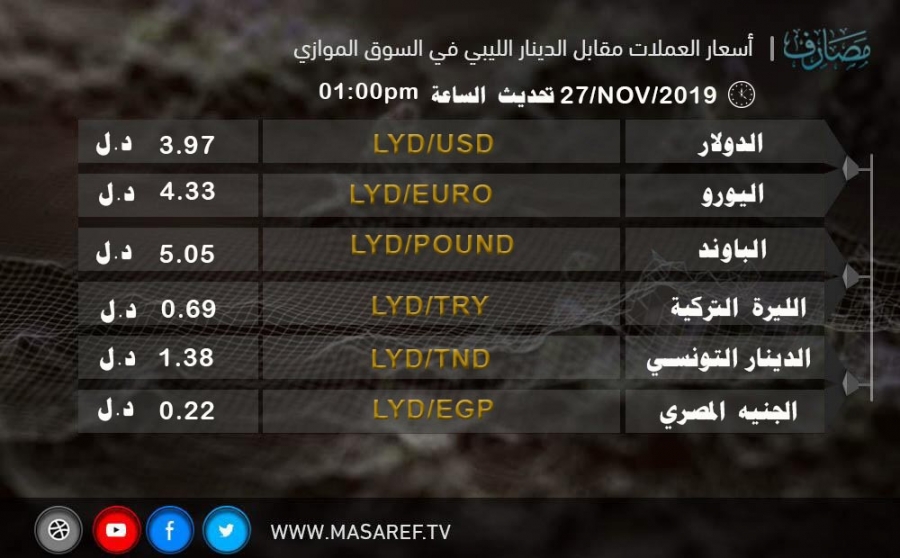 اسعار العملات مقابل الدينار الليبي في السوق الموازي 2019/11/26