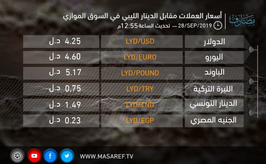 اسعار العملات مقابل الدينار الليبي في السوق الموازي2019/09/28