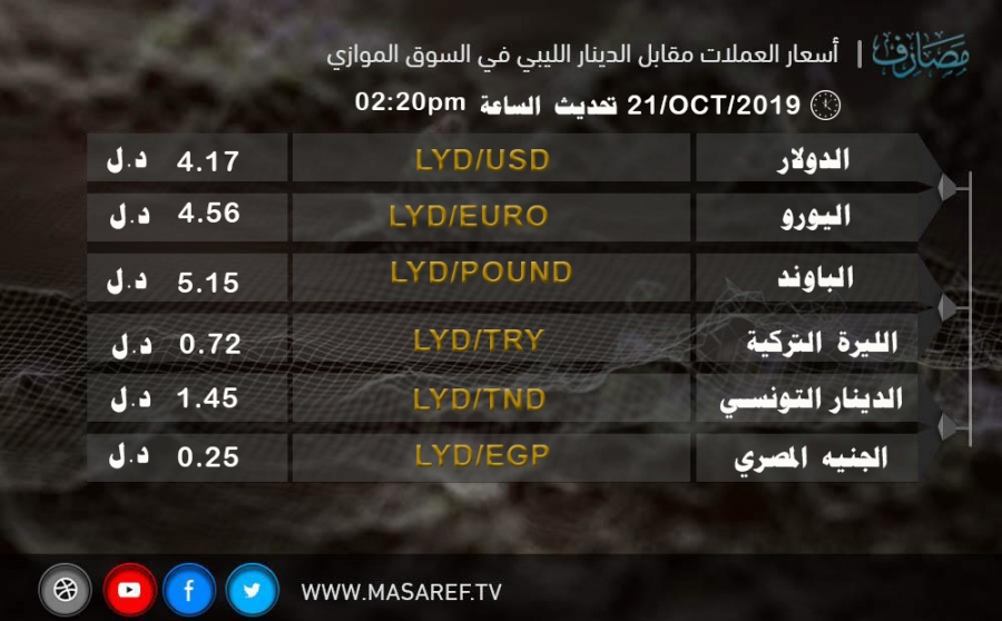اسعار العملات مقابل الدينار الليبي في السوق الموازي 2019/10/21